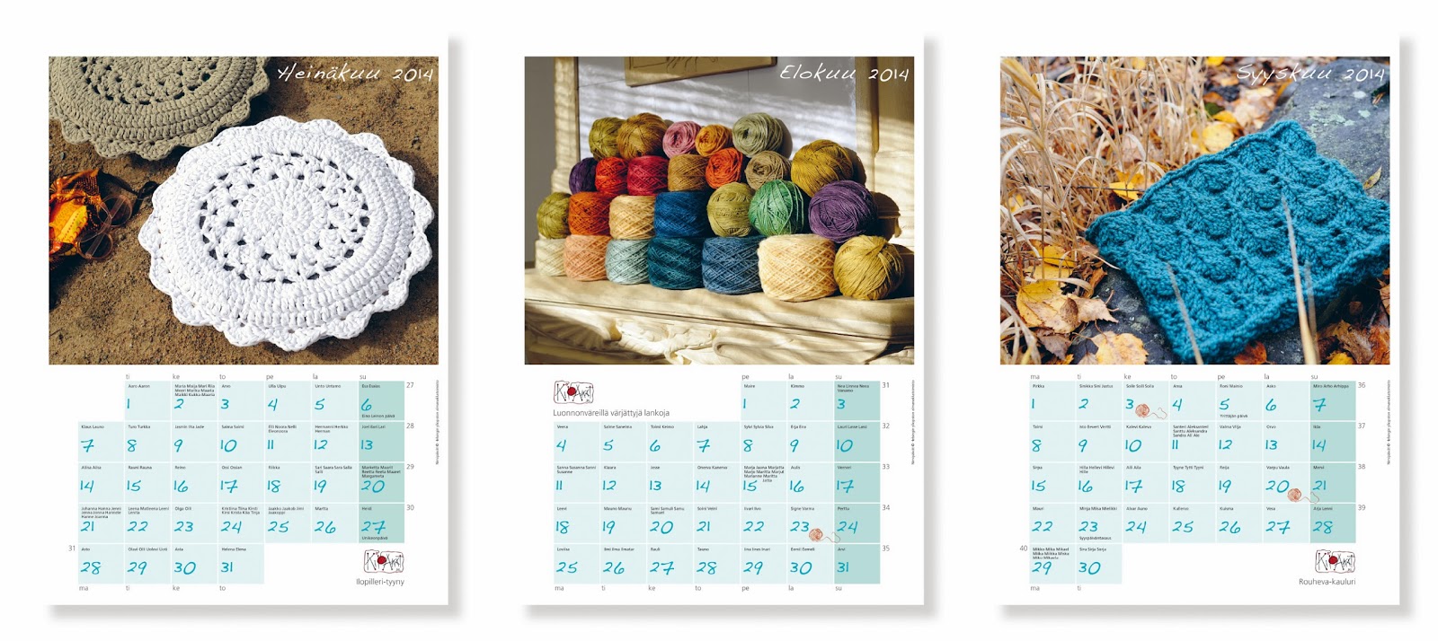 ...mutta nyt on taas ilmestynyt uunituore Kipakat-kalenteri vuodelle 2014! Mukana uusien neule- ja virkkausohjeiden lisäksi koukkuamista. Tälläkin kertaa mukana ovat nimi- ja juhlapäivät. Kalenterin koko on A4, kierresidonta ja sama hienostunut paperi kuin aikaisemmin.Kalenteria olivat tekemässä seuraavat Kipakat: Ari, Eeva, Helena, Jaana, Johanna, Katja, Mari, Marja, Mervi, Mette, Pirkko, Tiina E., Tiina O., Tiina R., Sanna sekä Tuula. Kiitokset! Kiitokset myös kuvausmalleille ja kuvausjärjestelijöille!